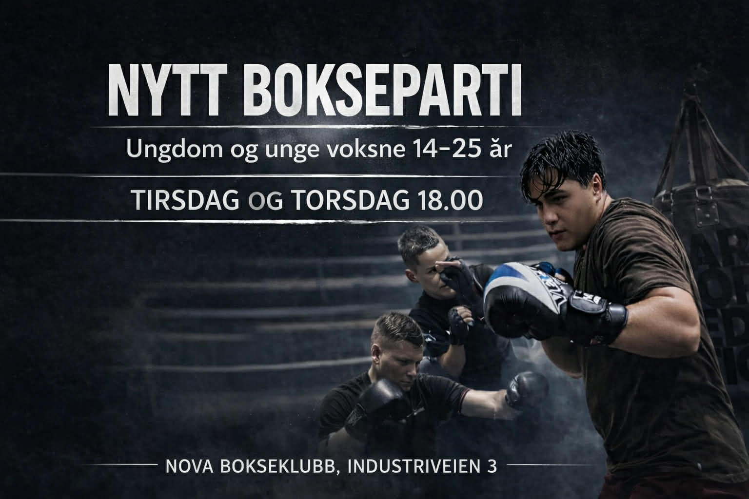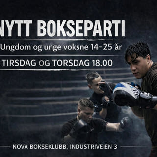 Endelig kan vi presentere vårt helt nye bokseparti for ungdom og unge voksne i alderen 14 - 25 år. Går du på ungdomsskolen eller er i midten av 20-årene er dette partiet perfekt for deg. Ingen forkunnskaper behøves og det eneste du trenger å ha med deg er innesko og en drikkeflaske. Vi har ingen ventelister, oppstartsdatoer eller andre ting å ta hensyn til, her kan du starte akkurat når du vil.